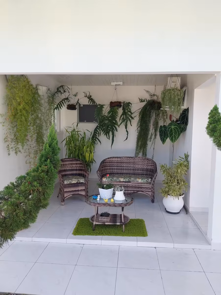 Com flores coloridas e variadas, folhagens e plantas de diferentes tamanhos, texturas e cores, o quintal emoldura a parte externa da casa e conta com uma moderna área de festa, onde a família e os amigos são recebidos em ocasiões especiais.