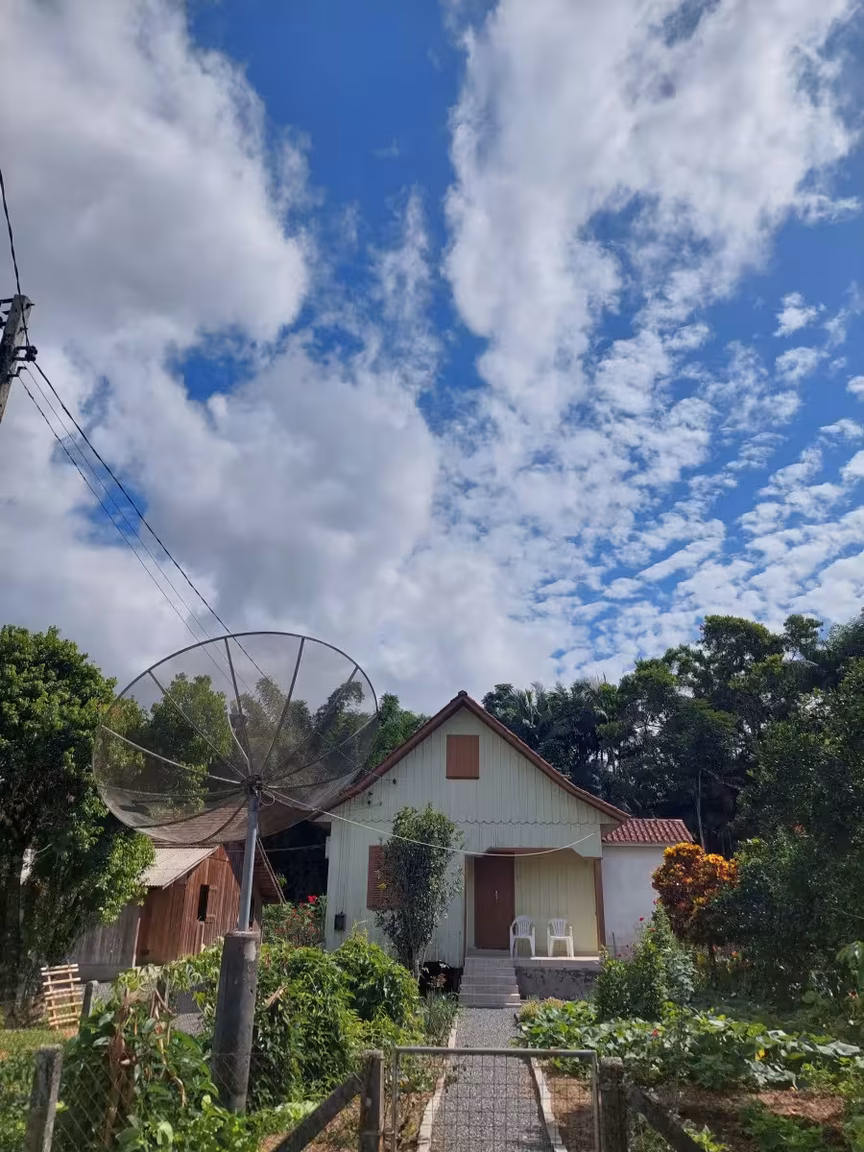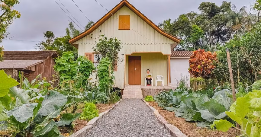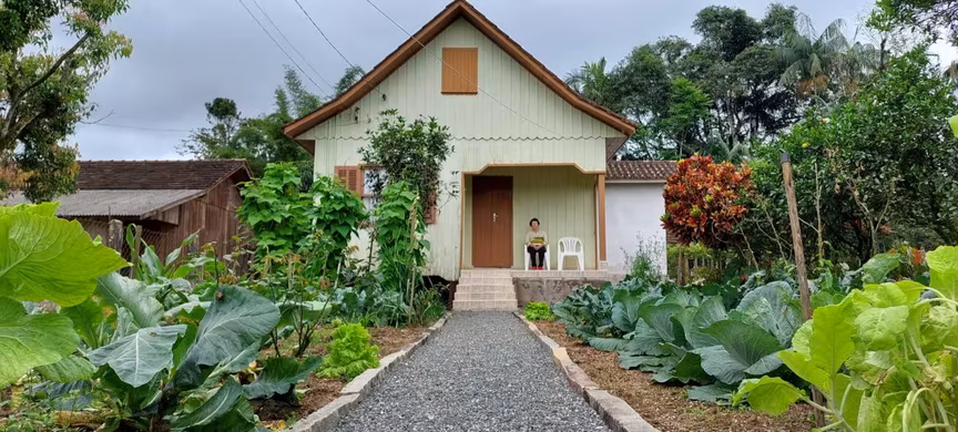 Tudo em volta da casa é muito bem cuidado e como não poderia faltar em uma propriedade de descendência alemã, temos em frente um maravilhoso quintal com hortaliças e flores, ajudando a emoldurar todo aquele ambiente externo.