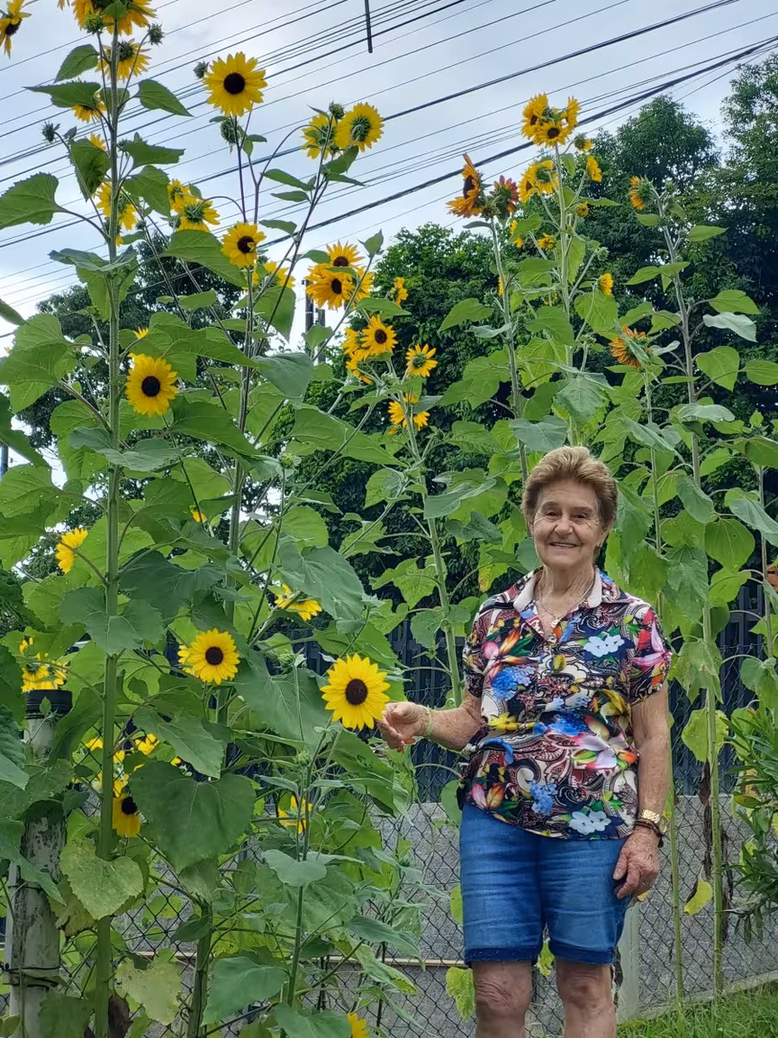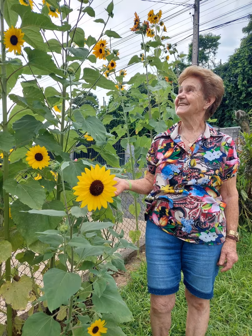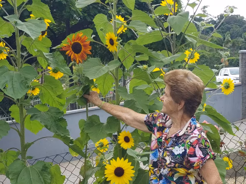 "Muitas pessoas que passam na rua param e tiram fotos de minhas flores. Os girassóis são a bola da vez e isso me enche de alegria servindo de incentivo a gostar cada vez mais do meu quintal", explica Vó Matilde.