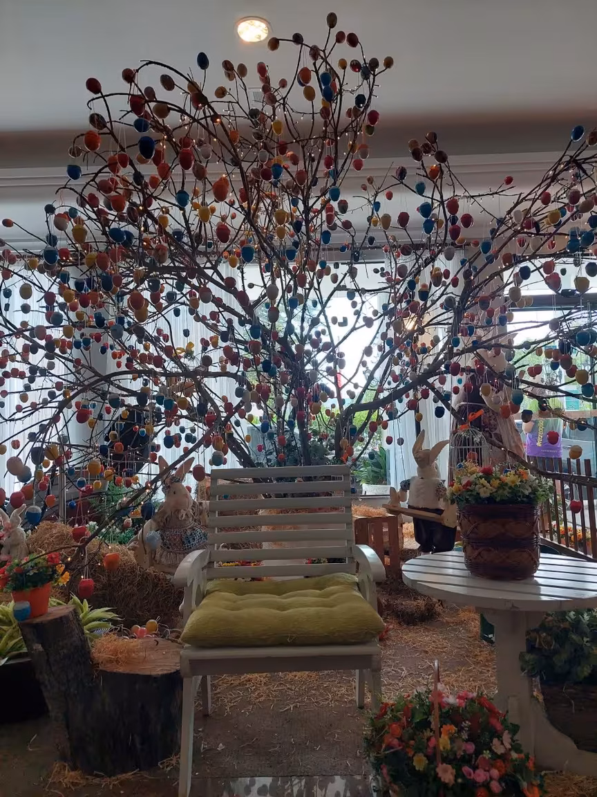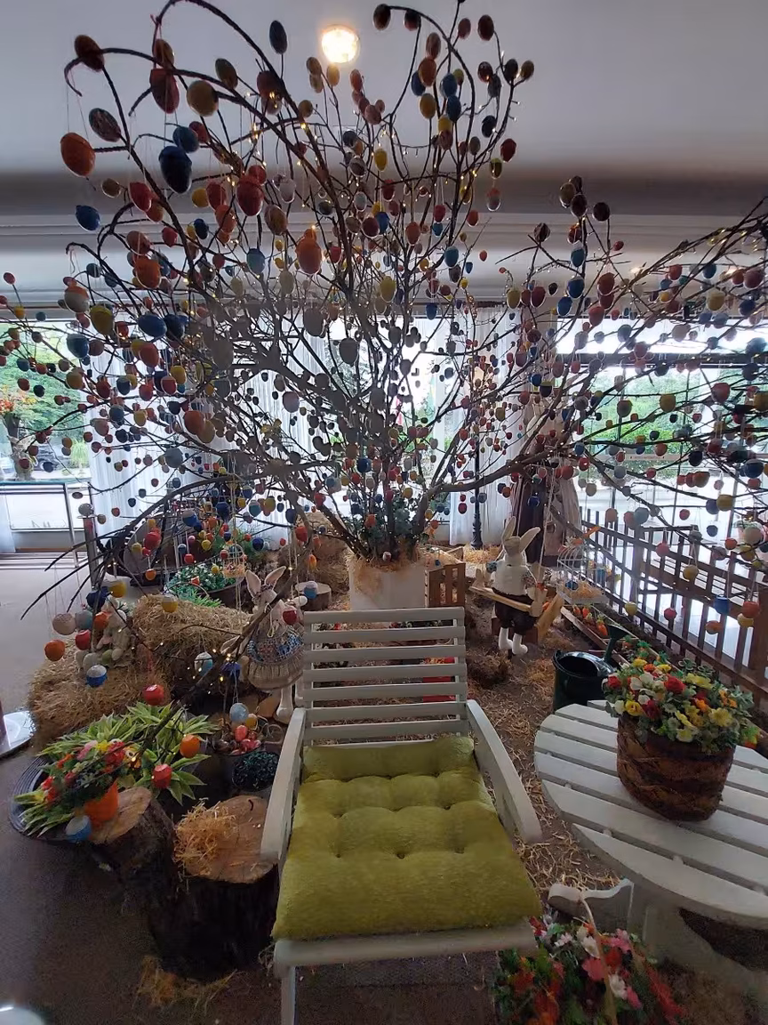 A árvore de Páscoa é rodeada por uma decoração impecável, repleta de detalhes que remetem à data comemorativa, como casquinhas pintadas, chocolates e bonecos de coelhos em todos os tamanhos.