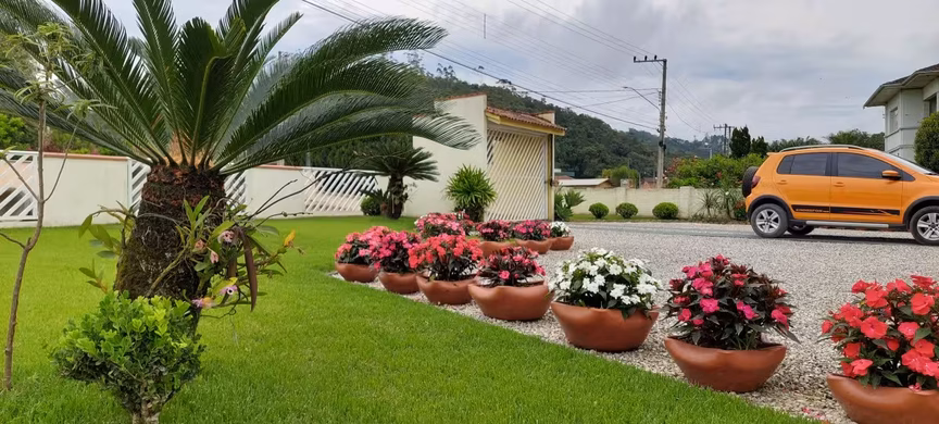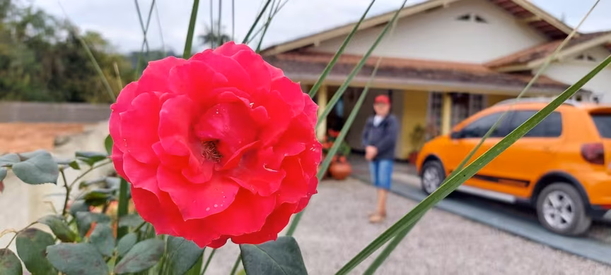 -Moradora de Guabiruba apresenta o jardim de sua casa.