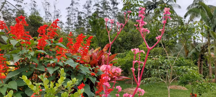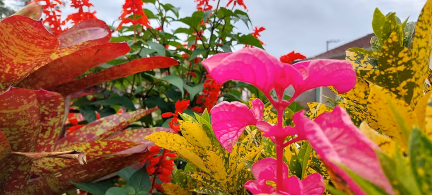 Flores coloridas variadas além de folhagens de diferentes tamanhos, texturas e cores, compõem o jardim que emoldura a parte externa de sua casa. Schlindwein falou à coluna: