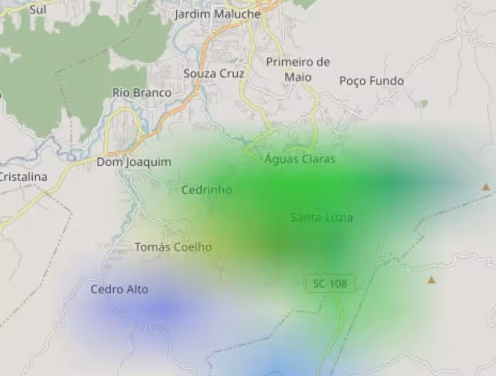 Podemos observar a ocorrência de chuva em Brusque em forma de pancadas isoladas nesse horário, ilustrada na mancha em verde da figura do mapa sobre os respectivos bairros mostrados em anexo: