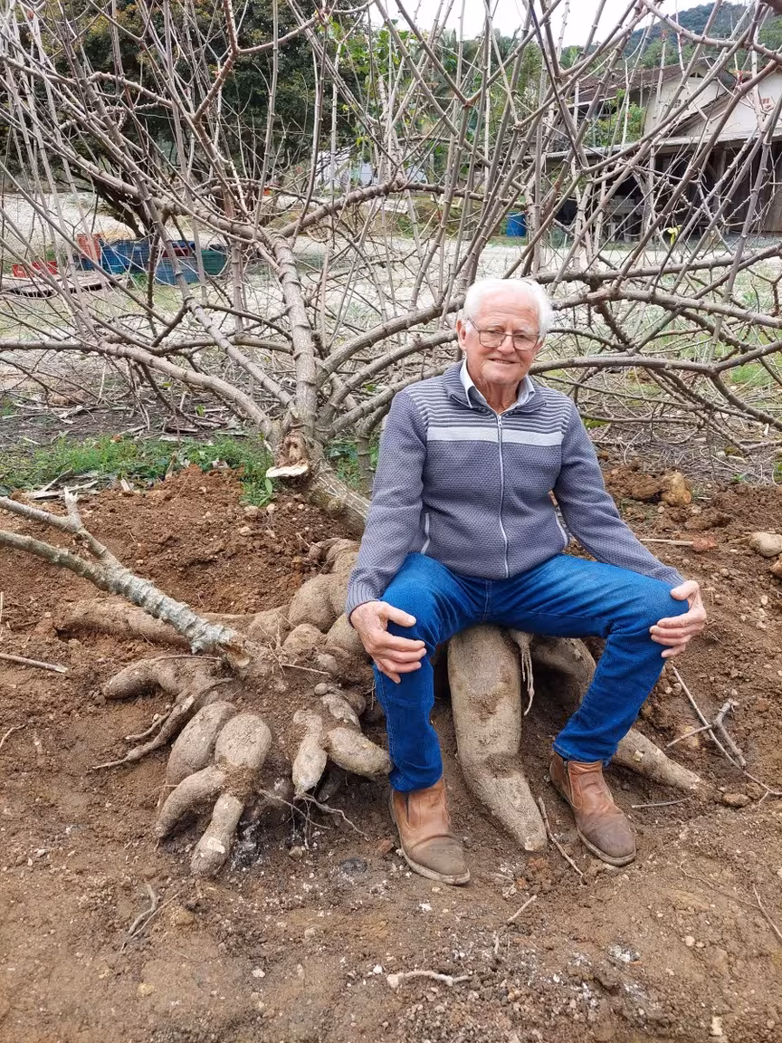 Uma colheita inusitada surpreendeu Vicente Voss, de 80 anos, morador da localidade de Cristalina, em Brusque, ao se deparar com uma raiz de mandioca gigante pesando 143 quilos ao todo. O fato ocorreu neste sábado, 13.