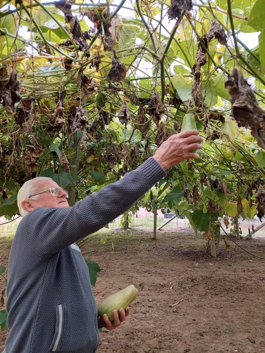 Vicente Voss, de 80 anos, se surpreendeu com a colheita inusitada que virou atração na vizinhança na manhã deste sábado