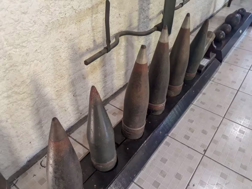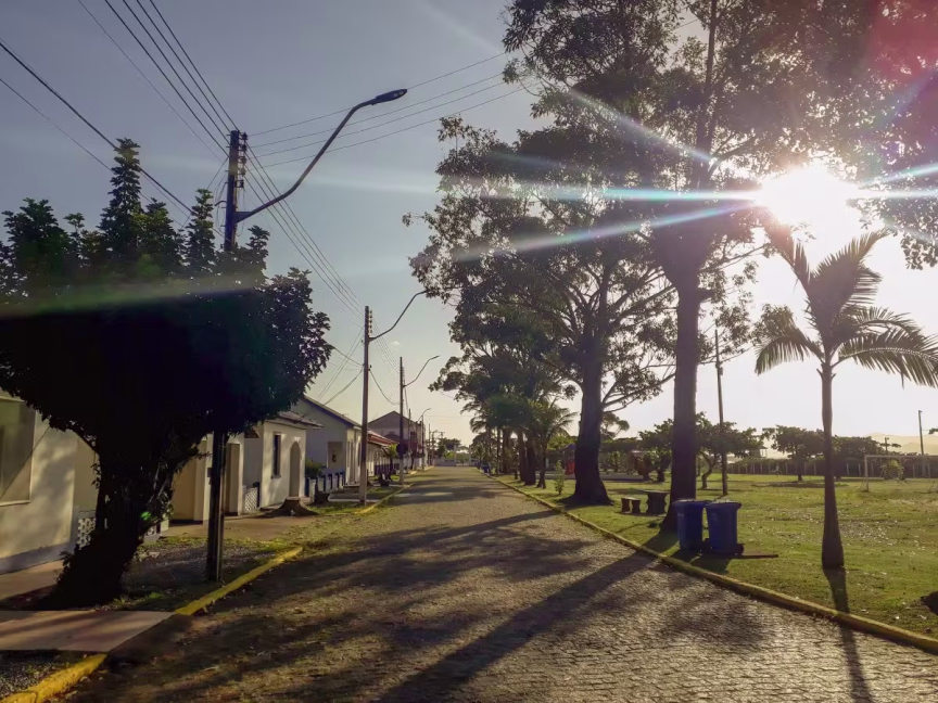 O espaço dá acesso ao Museu Militar através de uma estrada de terra repleta de curvas, ladeada por muita vegetação.
