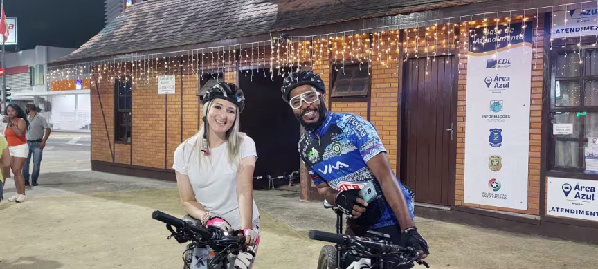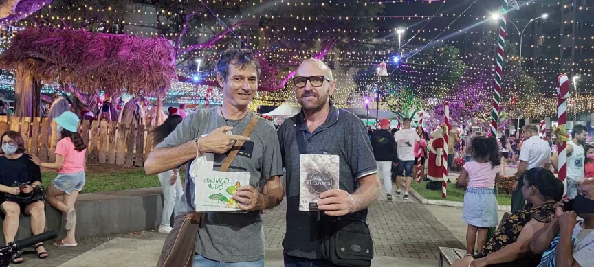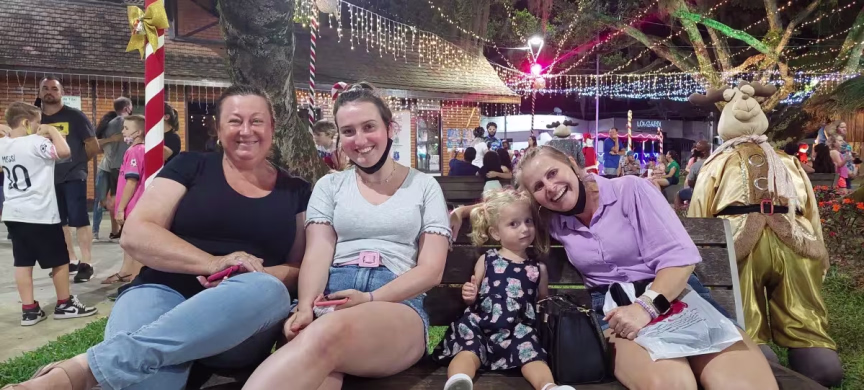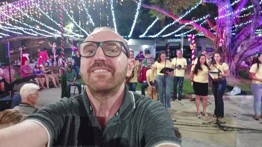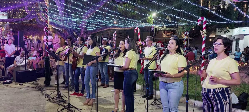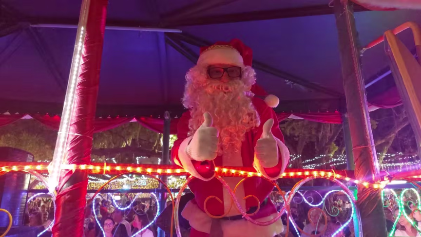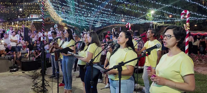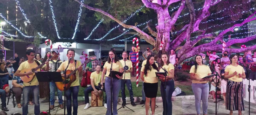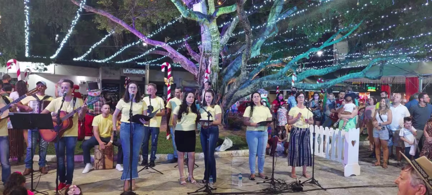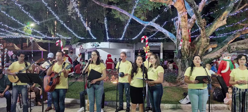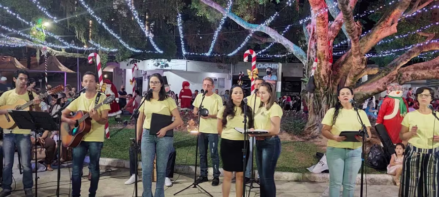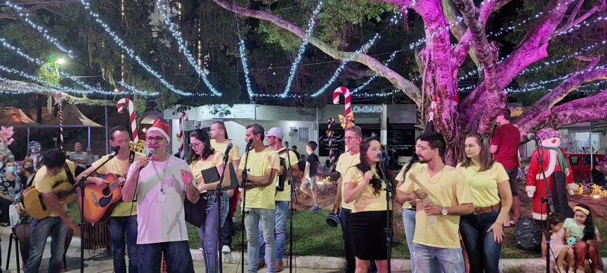Na sequência, temos o vídeo com imagens capturadas na noite de domingo junto à Aldeia do Papai Noel, no Centro de Brusque, que mostram a apresentação do grupo Vozes de Luz.
