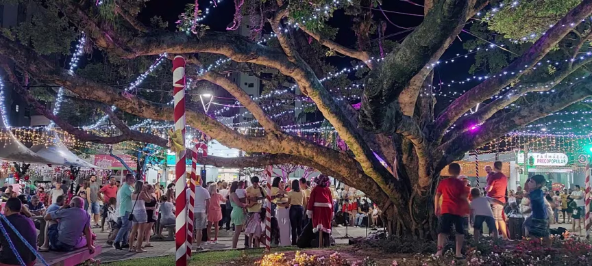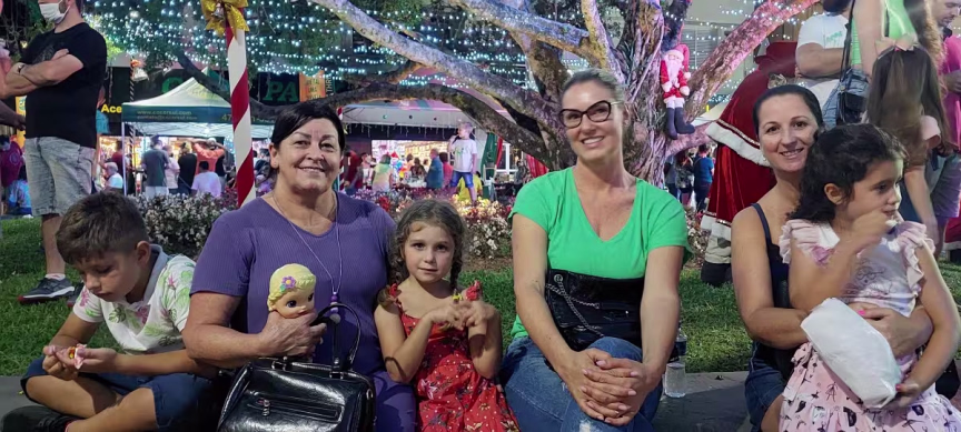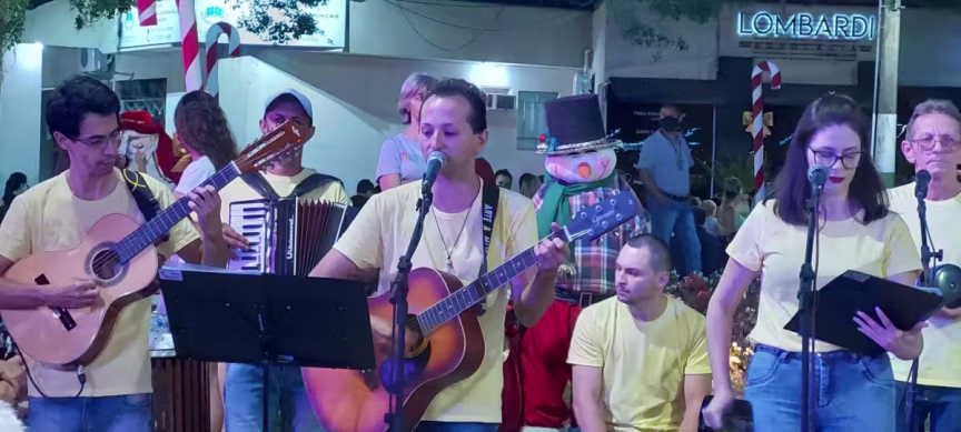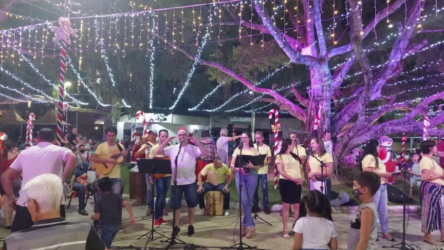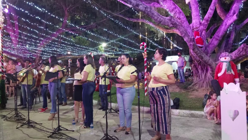Pessoas de todas as idades estiveram presentes na Aldeia do Papai Noel para assistir a cantoria, que teve seu início logo após o encerramento da missa das 19h da Paróquia São Luiz Gonzaga.