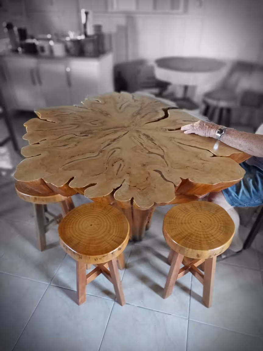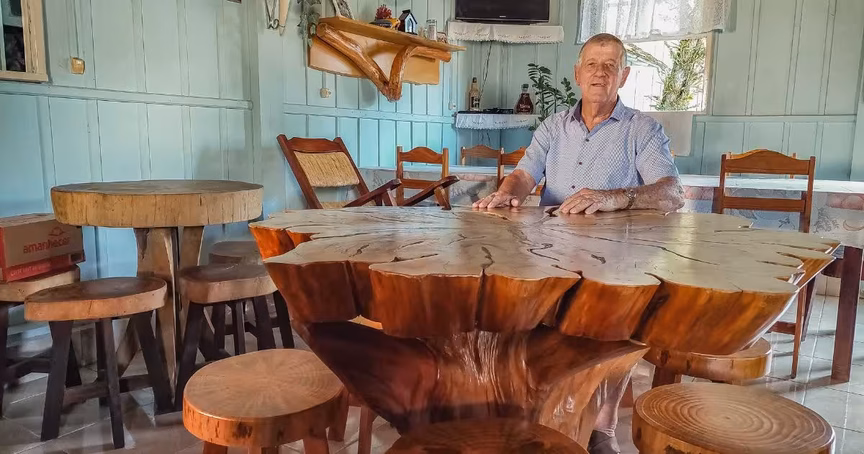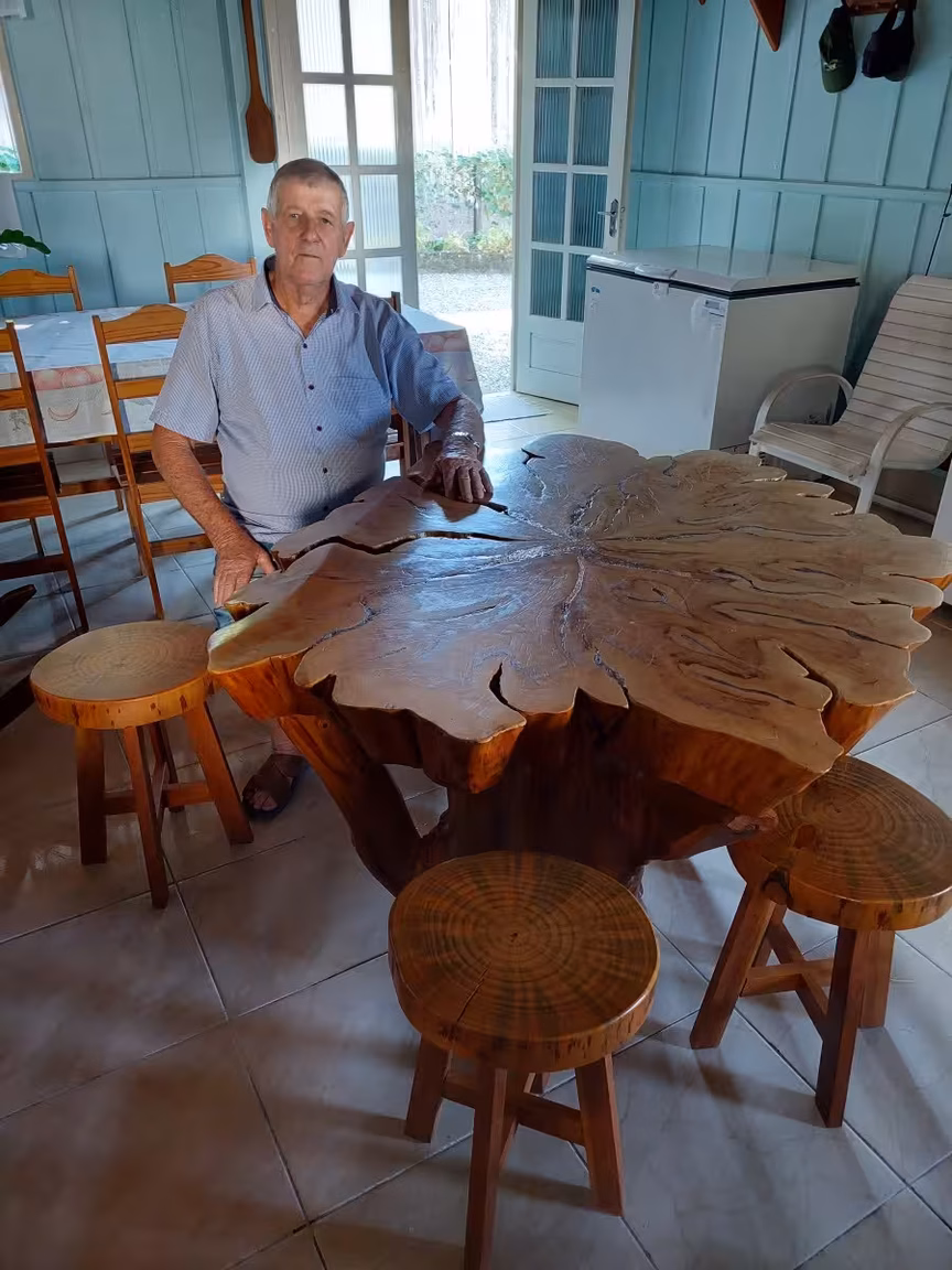 Laudelino Kohler, um senhor de 78 anos, residente no bairro Pomerânia em Guabiruba, é um verdadeiro artista. Com habilidades incomparáveis, ele transforma troncos de árvores em obras de arte, como mesas e cadeiras belíssimas. Embora essa destreza seja conhecida por muitas pessoas no município, Laudelino não as vende, mas as têm somente como um hobby.