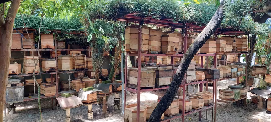 Conforme o meliponicultor, para conseguir manter toda essa estrutura funcionando são utilizadas cerca de trezentas caixas, todas fixadas numa área destinada para esse fim, em anexo à sua casa.
