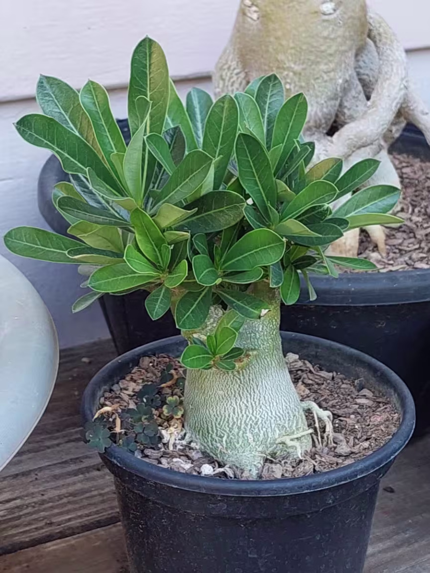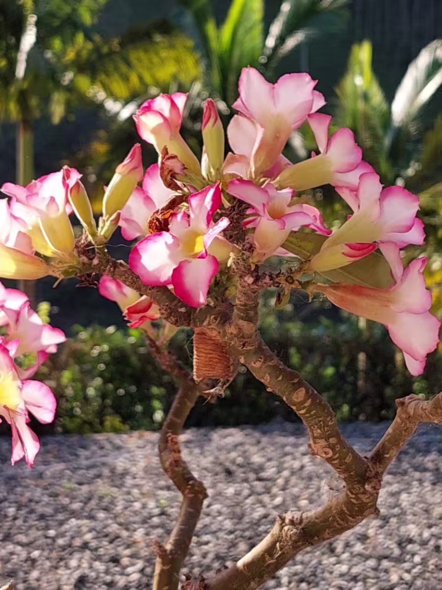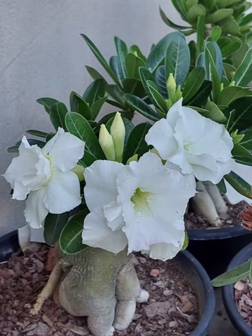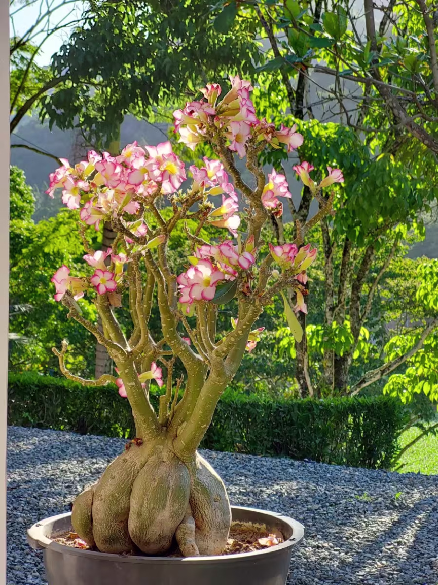 "Sim, as rosas do deserto necessitam de umidade em abundância. Você pode molhar com uma boa quantidade de água cuidando para não deixar a base encharcada. Durante o inverno eu rego uma vez por semana e no verão todos os dias", explica Marcela.