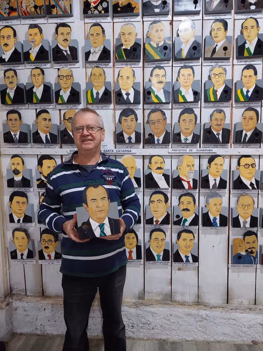 Não é possível esquecer os rostos também pintados de todos os prefeitos que já passaram por Guabiruba, inclusive seu pai, Ivo Fischer. "As casinhas de pessoas são as que mais gosto de fazer porque eu adoro desenhar e pintar", relata Leonardo, que descobriu a paixão desenhando e pintando, por conta própria, quadros de seu autorretrato e de sua família.