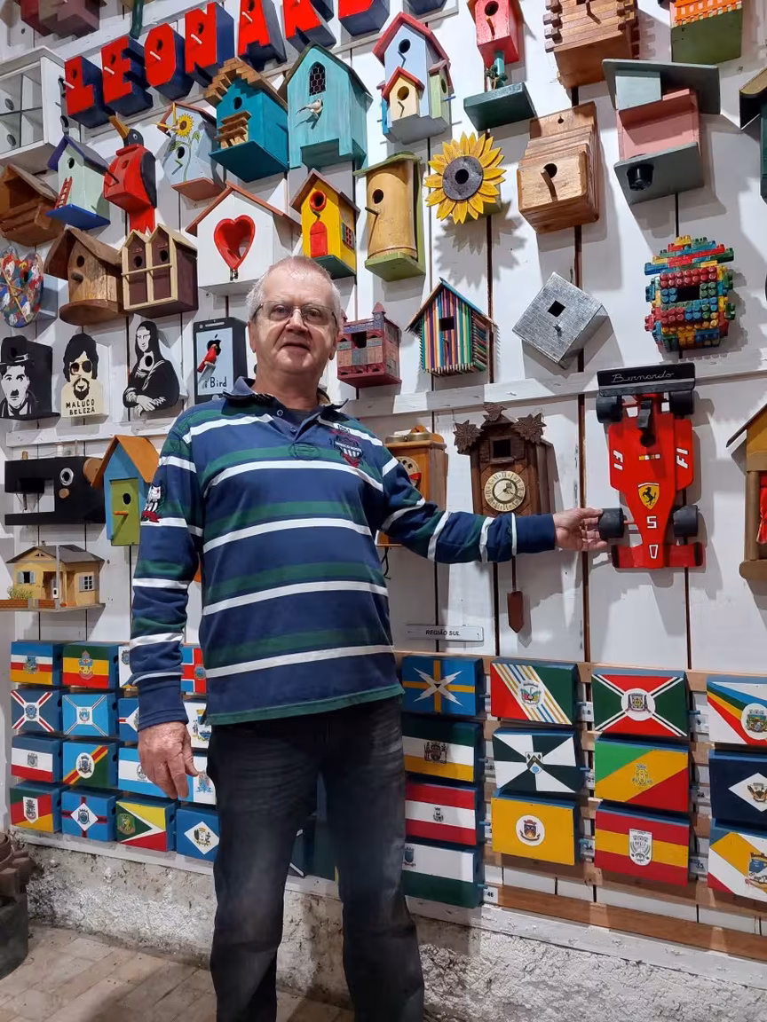 "Eu me encontrei e é isso o que eu gosto de fazer", diz Leonardo Fischer sobre a paixão por fabricar casinhas para pássaros. Filho do falecido prefeito de Guabiruba, Ivo Fischer, Leonardo sempre teve o sonho de trabalhar com marcenaria.