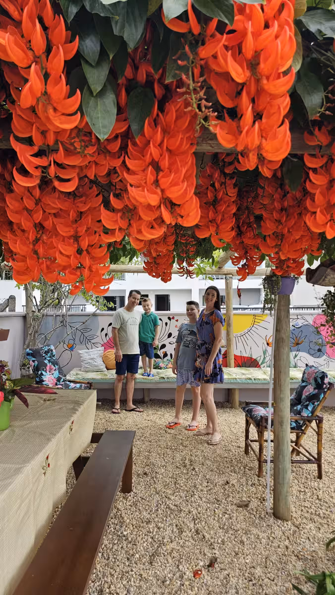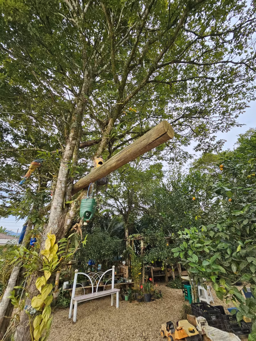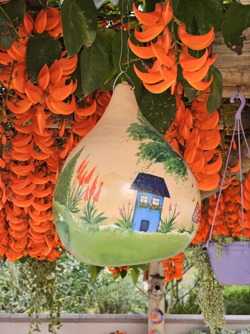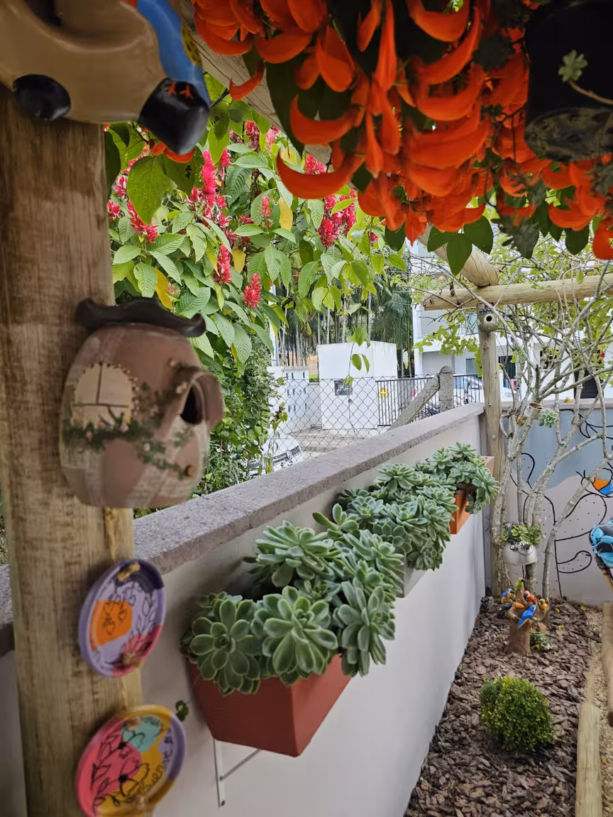 Márcia é uma verdadeira apaixonada por flores e plantas, e sua habilidade com pinturas também se destaca. Ao lado do pergolado e de um balanço, que a família utiliza para desfrutar de momentos tranquilos, ela criou algumas pinturas encantadoras.