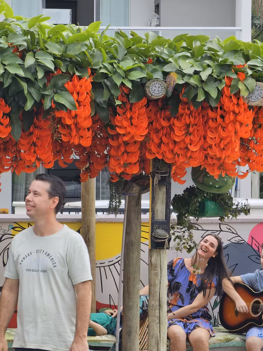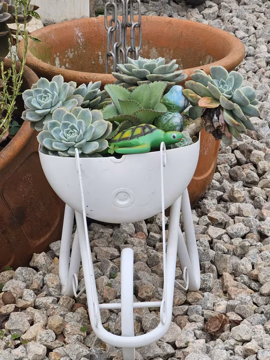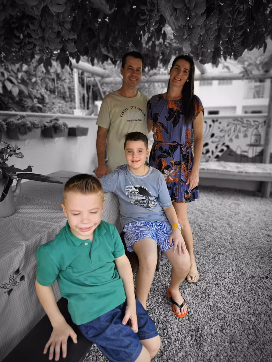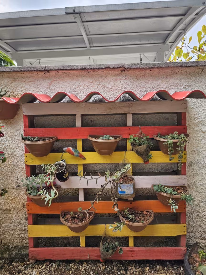 Márcia é uma verdadeira apaixonada por flores e plantas, e sua habilidade com pinturas também se destaca. Ao lado do pergolado e de um balanço, que a família utiliza para desfrutar de momentos tranquilos, ela criou algumas pinturas encantadoras.