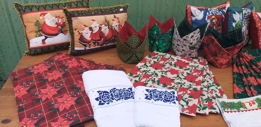 Na oportunidade serão comercializados panos de louças decorados, jogos de cozinha, necessaire, bolsas, jogos de toalhas de banho/rosto/lavabo bordadas, peças de crochê, trilhos de diversos modelos e tamanhos, almofadas, entre outras. Além disso, diversos itens de Natal estarão à disposição para serem adquiridos.
