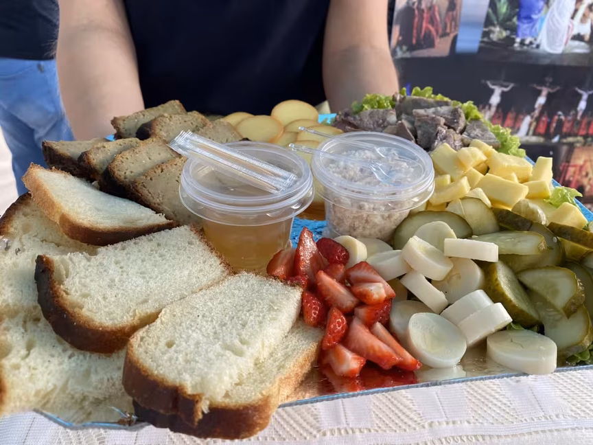 O prato serve duas pessoas e vem com pão de batata e pão de milho caseiro, queijo colono e queijo com ervas, dois tipos de embutidos (linguiça tradicional e embutido alemão), palmito e pepino, patê a base de queijinho e linguiça e geleia e fruta. O valor é de R$ 45.