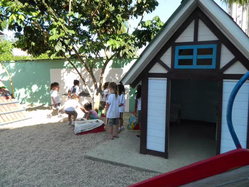 A casinha já existia no parquinho, mas também atrai a atenção dos pequenos. Meninos e meninas pegam a vassoura para varrer a casa enquanto outros brincam nos pneus de areia, localizados ao lado da casinha.
