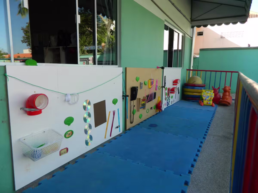 Do outro lado do parque, próximo ao berçário, foi criada a parede sensorial. O intuito deste ambiente é trabalhar as sensações dos bebês. Foram colados e pregados vários objetos em uma parede, desde controles e telefones, a canos e tomadas (sem energia).