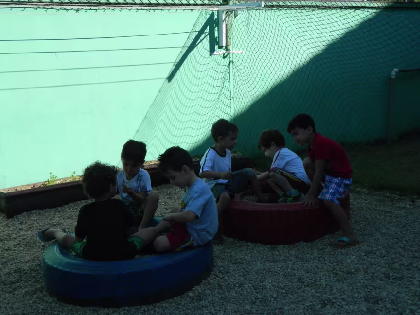 “São dois pneus grandes de caminhão, que nós enchemos com areia e eles amam. Não tem nada diferente, nada de especial. Mas é uma coisa que mexe com a imaginação deles porque eles criam muito, eles vivenciam a imaginação. Então ali eles fazem de mesinha, de poltrona, de cama.”