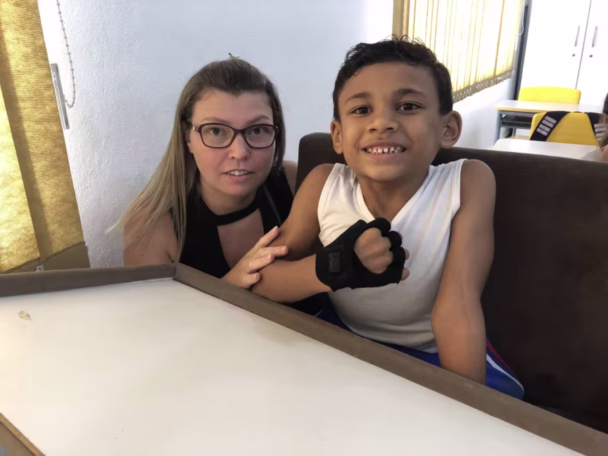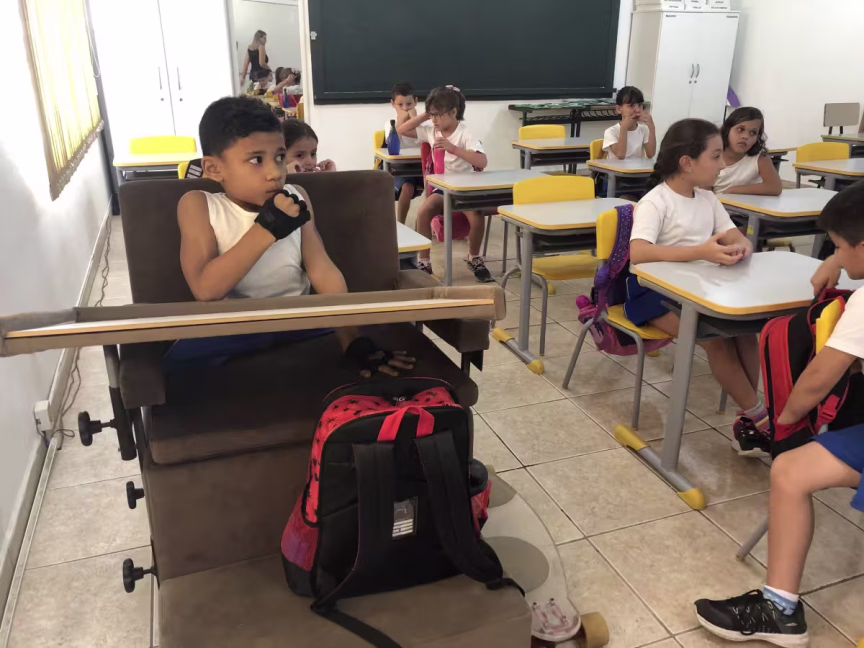 Em sala de aula, Nick também é participativo. Quando tem atividades para fazer no quadro, Janaina coloca uma cadeira para o aluno subir e participar. Para assistir as aulas com mais conforto, os pais providenciaram uma poltrona adaptada. “Antes ele ficava na carteira normal, mas reclamava de dores na coluna”, conta a mãe.