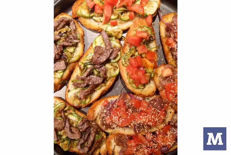 ☆ fatias de pão italiano pinceladas com azeite de oliva e tostadas em frigideira;