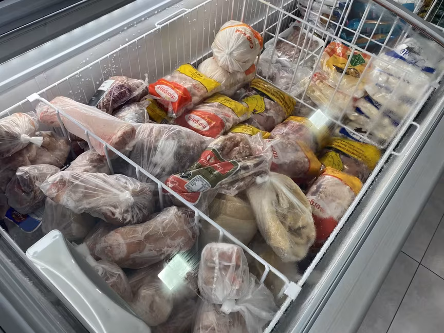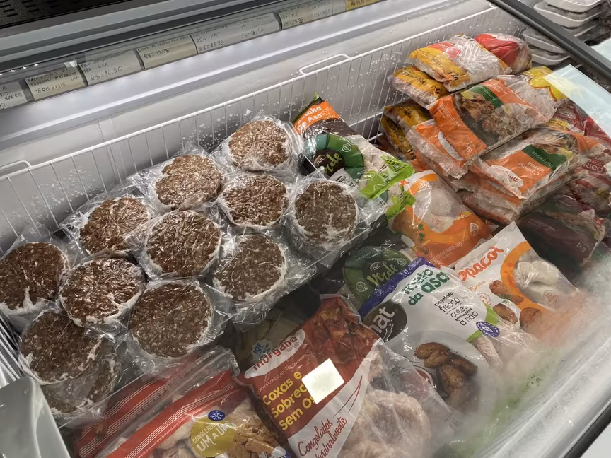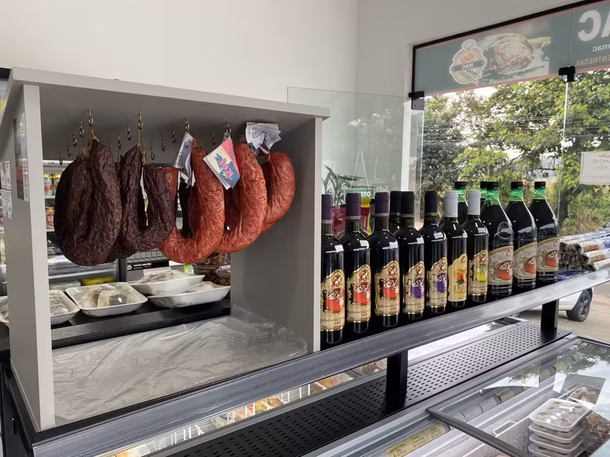 No local, são encontrados carnes bovinas, suínas e de frango, além de opções de acompanhamentos, como batatinhas e aipim, temperos, como limão e ervas, carvão e bebidas, como vinhos e cervejas.