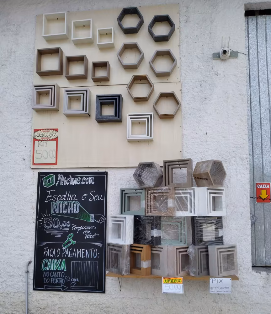 "Eu trabalho com móveis sob medida e tenho uma pequena marcenaria. Aqui, fabrico esses 'kit nichos' e deixo na porta pra vender. Quando saio pra fazer as montagens, a marcenaria fica fechada, isso também vale para os finais de semana. Como tem alguns nichos pendurados na parede do mostruário, o pessoal às vezes queria comprar, mas eu não estava lá", relembra.