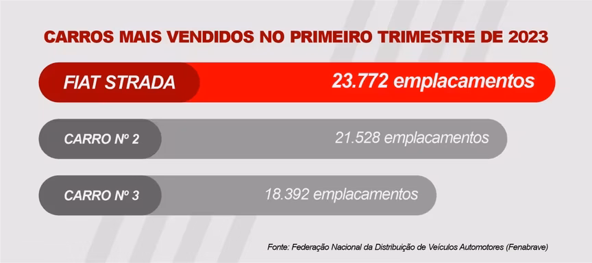 Além da liderança geral, a Strada também está em primeiro lugar entre os carros comerciais leves no primeiro trimestre de 2023. No total, o veículo da Fiat teve 10% mais emplacamentos do que o segundo colocado na lista dos mais vendidos entre janeiro e março deste ano.