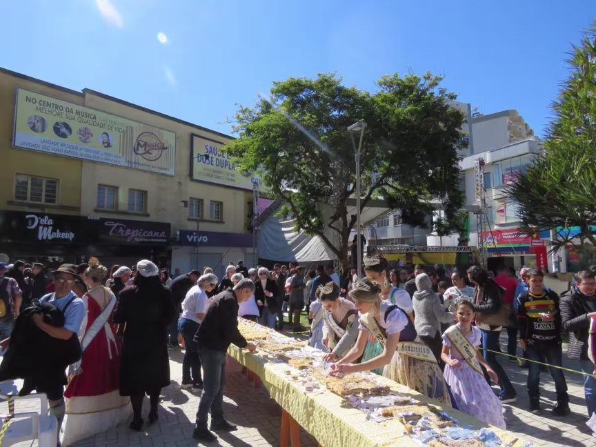 Os 159 anos de Brusque foram comemorados de uma forma deliciosa, neste domingo, 4: com o corte de uma cuca gigante. A tradição teve novidades neste ano, já que foi preparada por funcionárias da rede municipal e o prato foi servido na praça Barão de Schneeburg, no Centro, logo após o desfile.