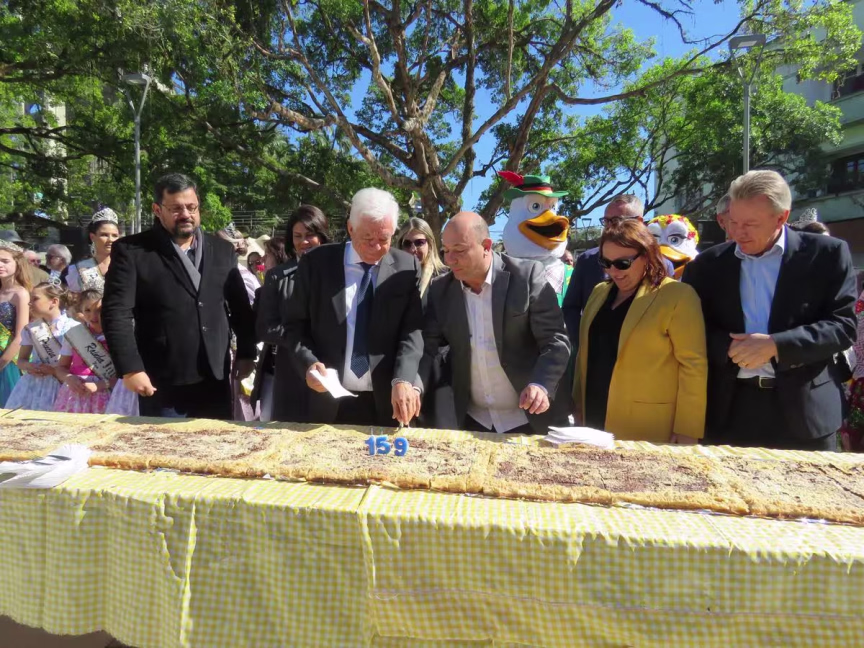 O prefeito Jonas Paegle e o vice-prefeito Ari Vequi cortaram a cuca gigante em parceria. Os secretários também marcaram presença, assim como integrantes da comitiva alemã de Karlsdorf-Neuthard, que estão em Guabiruba.
