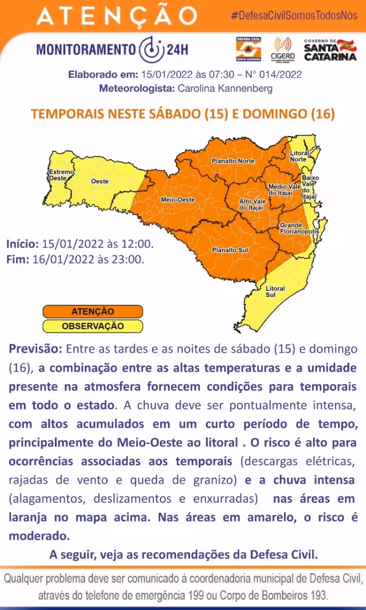 Para Brusque e região o alerta é de 'Atenção', conforme o mapa divulgado pelo órgão estadual.