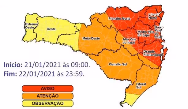 Segundo o alerta, os acumulados já passam dos 140mm nas últimas 72 horas no Vale do Itajaí, Grande Florianópolis, Planalto e Litoral Norte.