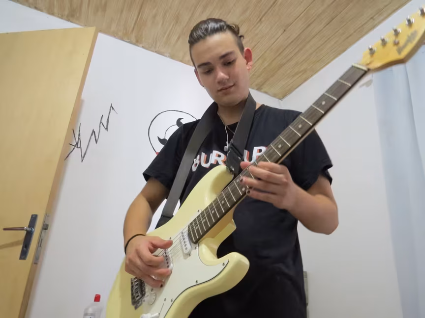“Quando eu tô triste, eu vou tocar música, quanto eu tô feliz também. A música é como eu expresso o que eu estou sentindo”, diz Ariel. “A influência da música é importante para o tratamento”, completa a mãe.