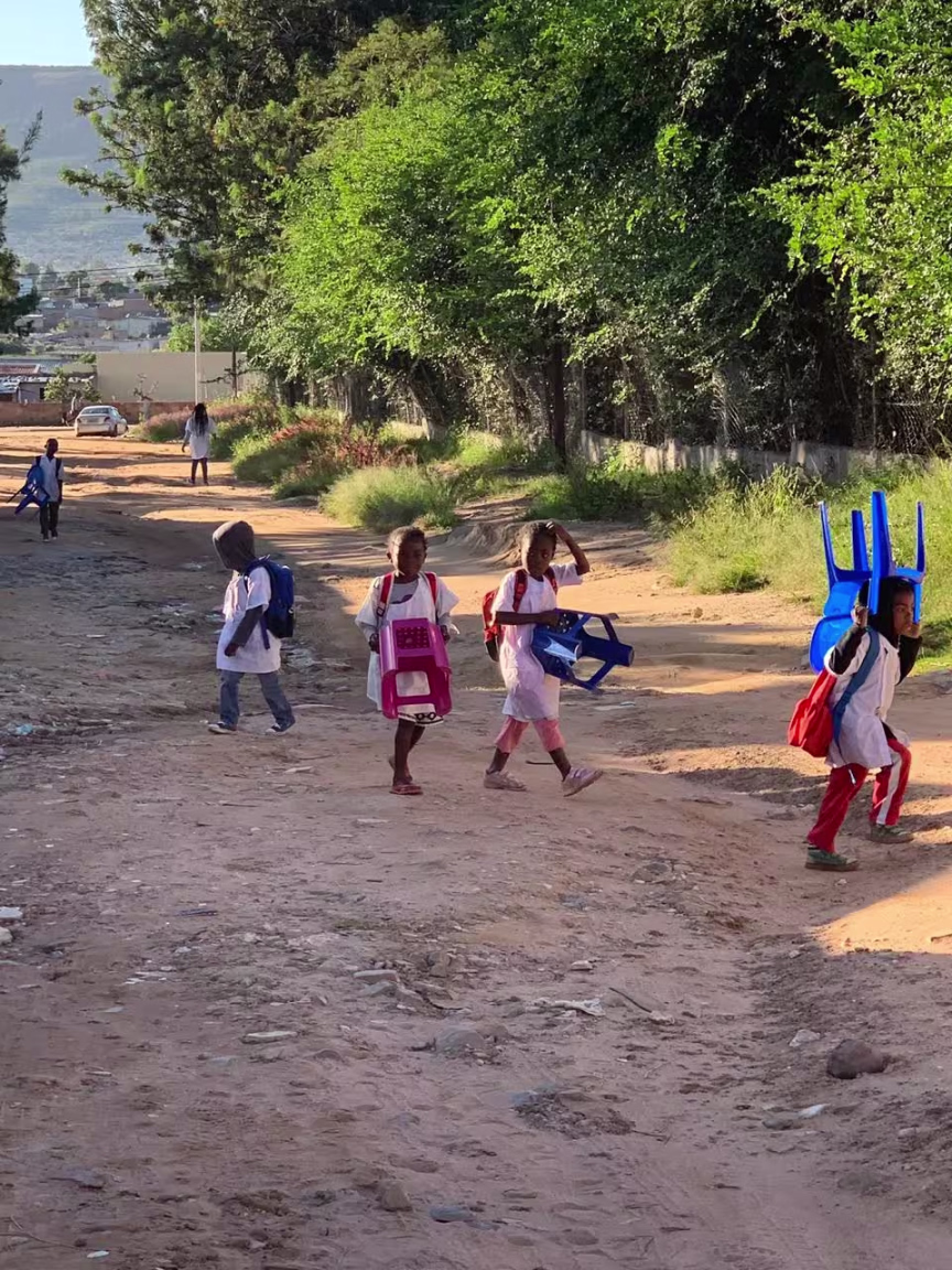 A escola também não tem muita estrutura e as crianças têm que levar cada uma a sua cadeira.
