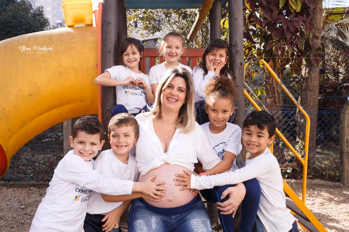 A diretora do Centro Educacional Infantil (CEI) dos Comerciários teve uma ideia diferente para fazer as fotos da gravidez do segundo filho. Anna Gevaerd Westarb, 36 anos, recebe constantemente o carinho das crianças da creche e por esse motivo decidiu realizar um ensaio com os pequenos e o barrigão de nove meses para registrar esses momentos.