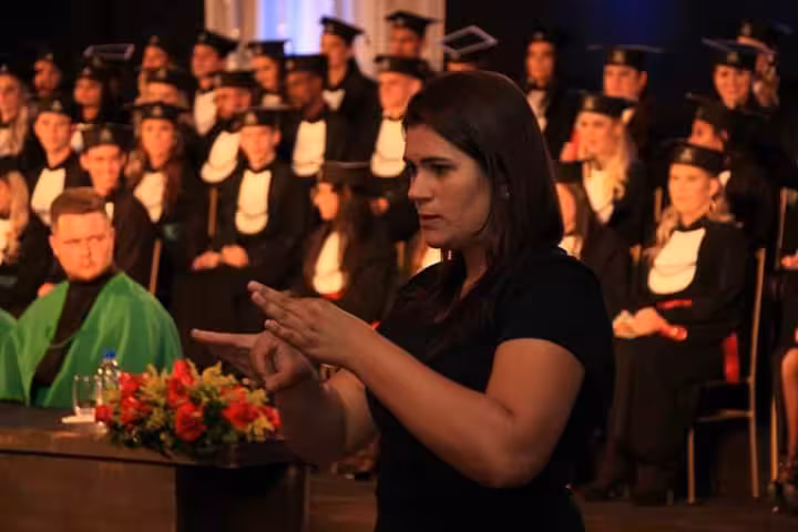 Rosana Jacinto é tradutora de Libras há 15 anos, e conhece a língua há 17. "Quando eu comecei só tinha curso técnico, com apoio da igreja católica, para ser intérprete nas missas. Depois de dois anos de curso, me formei intérprete", conta ela, que começou a atuar com Libras em Joinville.