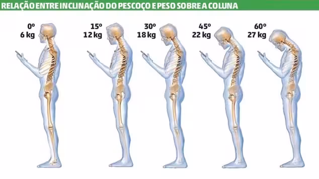 E qual seria a posição ideal para o uso do celular? Em posição ideal, as orelhas devem estar alinhadas com os ombros, o peso transmitido ao pescoço é de aproximadamente 6Kg. Esse valor vai sendo aumentado caso inclinemos o pescoço para frente. Com 15 graus de inclinação, a sobrecarga aumenta para 12Kg. Com 30 graus de inclinação aumenta para 18Kg. Com 45 graus de inclinação a sobrecarga já é de 22 Kg. Finalmente, com 60 graus de inclinação a sobrecarga chega a alarmantes 27 Kg.