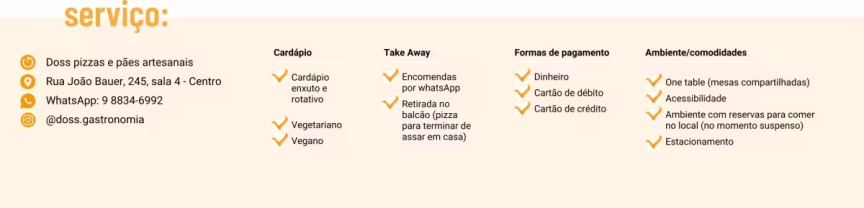 A Doss abre de quarta a domingo, das 17h às 21h. Quem quer ter a experiência de experimentar uma pizza de um jeito um pouco diferente, sempre fresca, deve fazer sua encomenda via WhatsApp. É importante lembrar que a loja de pizzas e pães rústicos não faz entrega. Atende apenas com consumo no local com reserva (temporariamente suspenso em razão da pandemia) ou retirada no balcão para terminar de assar em casa, sempre com encomenda. “Para comer a nossa pizza é preciso fazer a encomenda, se programar um pouco. Fazemos a quantidade exata de massas para o dia, devido ao processo de longa fermentação e aos ingredientes frescos”, ressalta. Na Doss, reserva-se a pizza e não o ambiente. Assim que todas as pizzas e pães são encomendados, é feito um comunicado nas redes sociais da loja: “encomendas esgotadas. Amanhã tem mais”. Ambiente informal Quem opta por saborear a pizza no local, também se surpreende com a informalidade do estilo de servir. As mesas são compartilhadas com o objetivo que os clientes se conheçam e se comuniquem. O ambiente não tem wi-fi, justamente para estimular a conversa olho no olho.