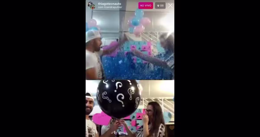 No fim, um balão gigante foi estourado e revelou que o casal espera um menino. "Foi bem legal, bem interativo. A gente se divertiu bastante", diz Thiago.