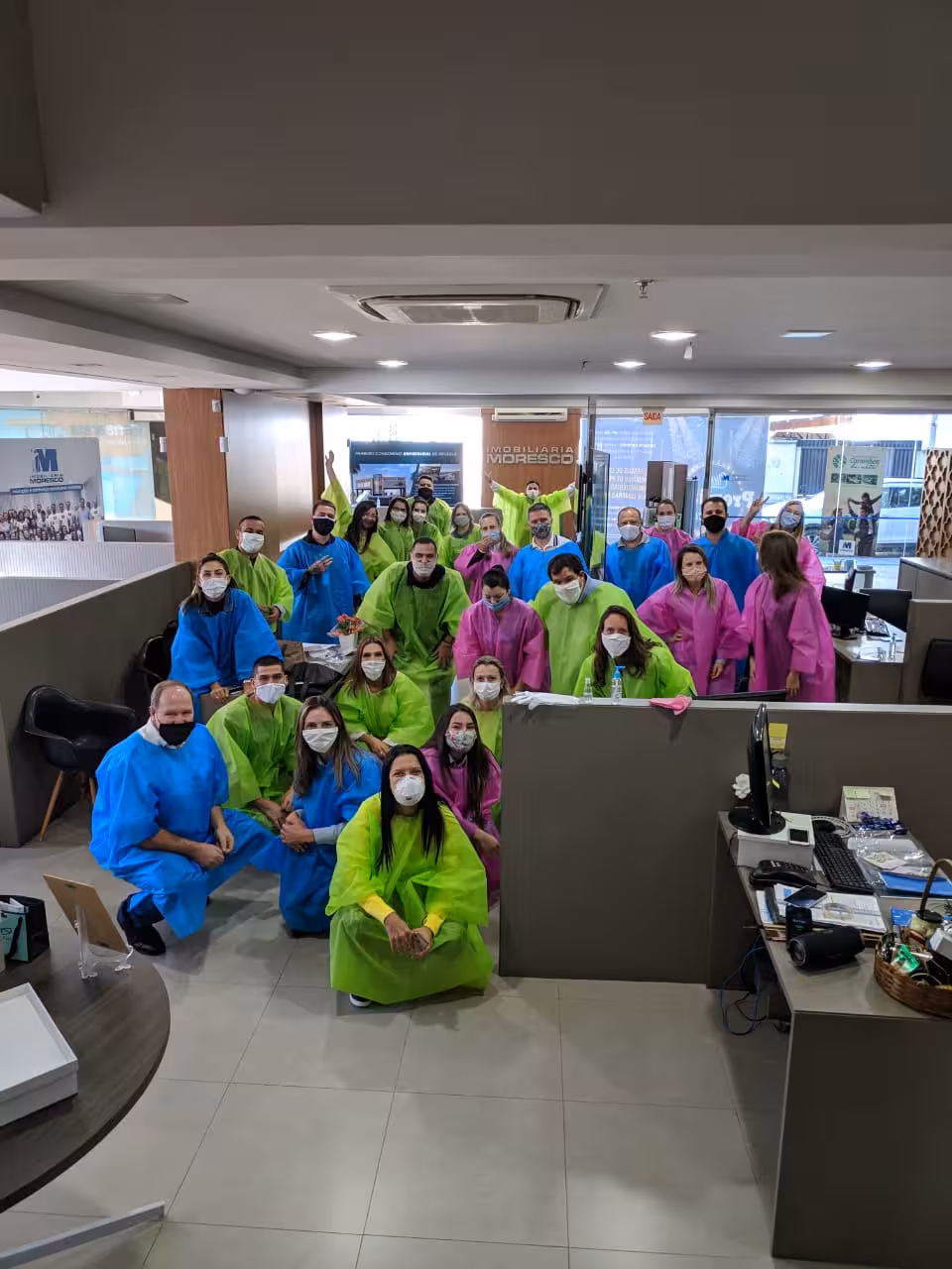 De acordo com a direção, a empresa costumava ter uma dinâmica semanal para a equipe do escritório, já antes da epidemia de coronavírus. Entre as atividades programadas estava uma que envolvia abraço entre os colegas.