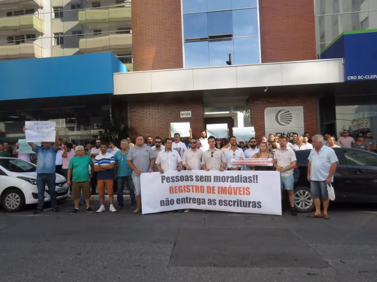 Empresários e profissionais do setor de construção civil de Brusque protestaram na manhã desta sexta-feira, 1º, em frente à sede do Ofício de Registro de Imóveis de Brusque, no Centro.
