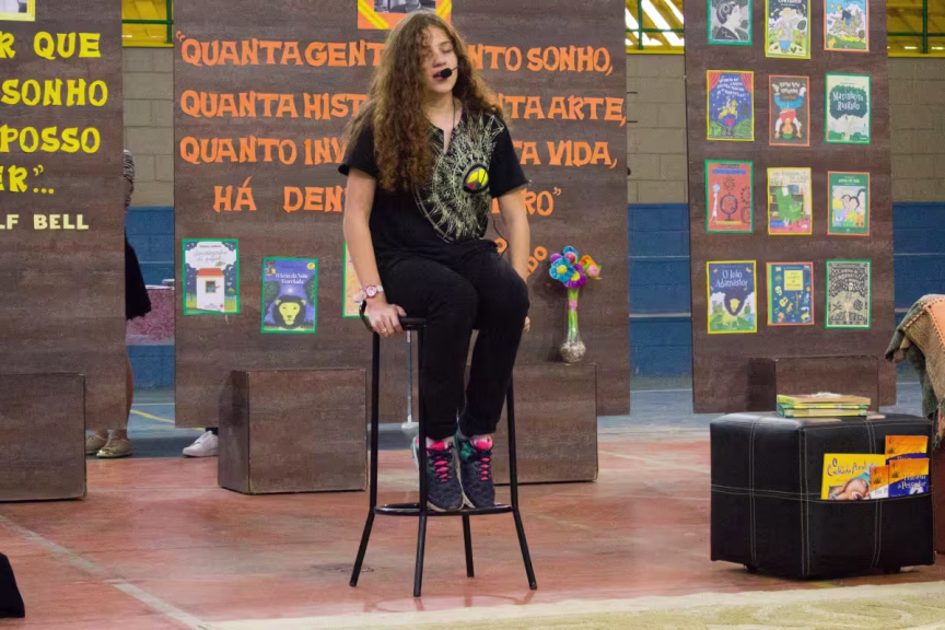 No dia do recital, os estudantes realizam apresentações artísticas e os escolhidos para apresentarem suas poesias podem utilizar do cenário especial para declamar ao público.
