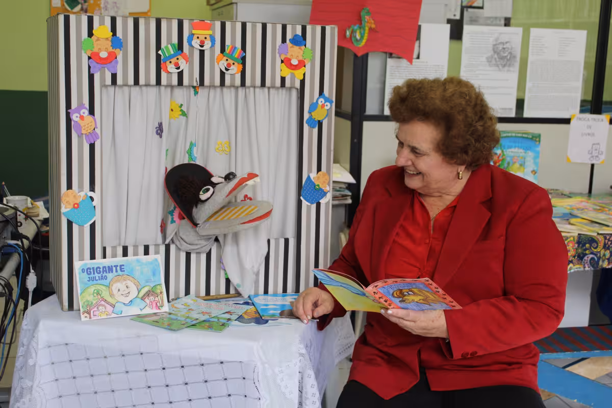 Há 20 anos, a escritora Terezinha Andrade Viecelli, de 75 anos, escreve livros infantis e visita escolas de Brusque e região para fazer contação de histórias para as crianças. Com fantoches feitos pela própria autora, a apresentação envolve e chama a atenção dos pequenos, que se entretêm e aprendem muito com a visita dela às salas de aulas.