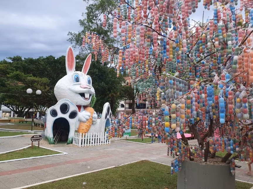 Além do “Coelhão”, na La Terza Pasqualina, o visitante também encontrará três árvores de Páscoa, duas delas repletas de casquinhas de ovos. São cerca de 80 mil unidades que foram pintadas pela comunidade e por alunos da APAE e escolas da cidade.