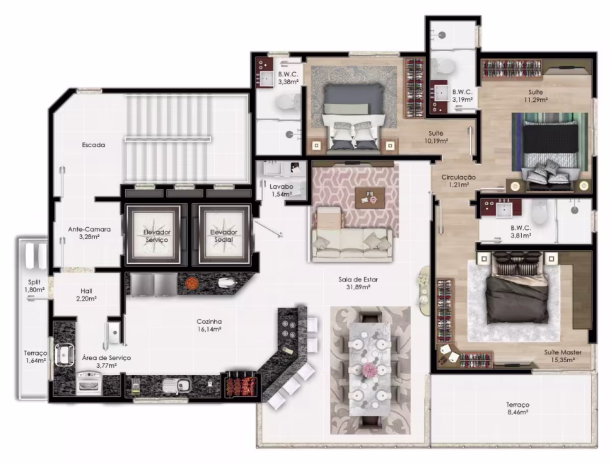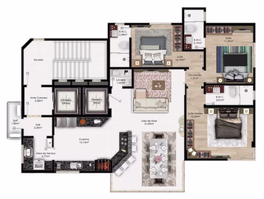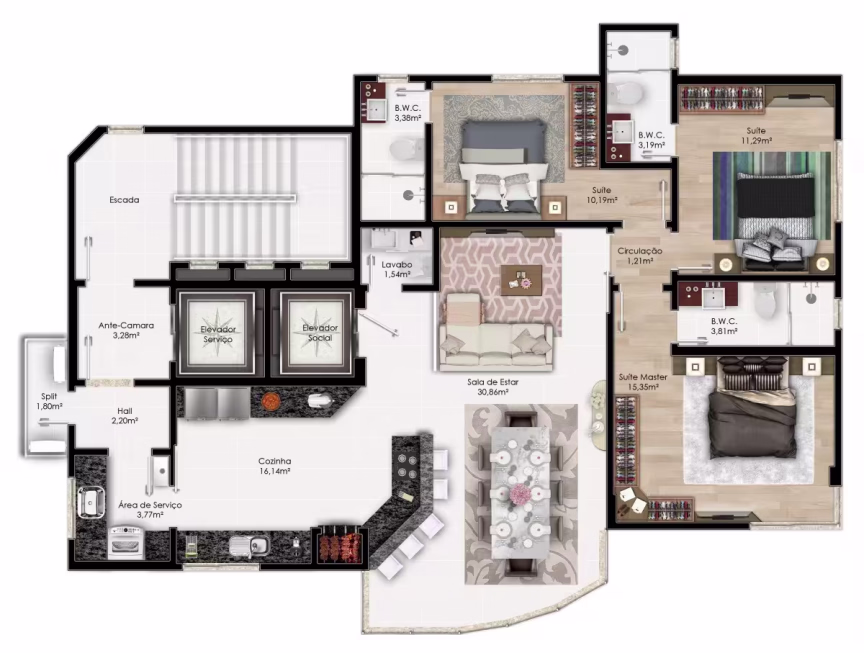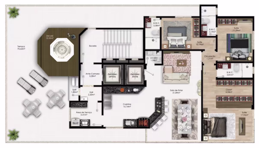 • 3 suítes • Até 4 vagas de garagem • 1 apartamento por andar • Espaço gourmet • Cinema • Academia • Sala de Jogos • Sauna • Playground • Piscina Adulto/Infantil • Área Molhada • Jacuzzi • Salão de festas • Apartamento diferenciado com 400m² de área total • Apartamentos com 250m² de área total.