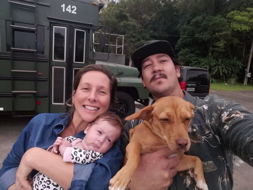 Numa passagem por Joinville, encontraram a cachorrinha Noah abandonada em um posto de gasolina. Desde então, acolheram-na e ela passou a viajar com o casal no ônibus. "Para onde a gente vai, ela vai junto", diz Morgana. Hoje, ela divide o espaço com a filha do casal, que recentemente começou a engatinhar e provoca "ciúme" na cachorrinha.