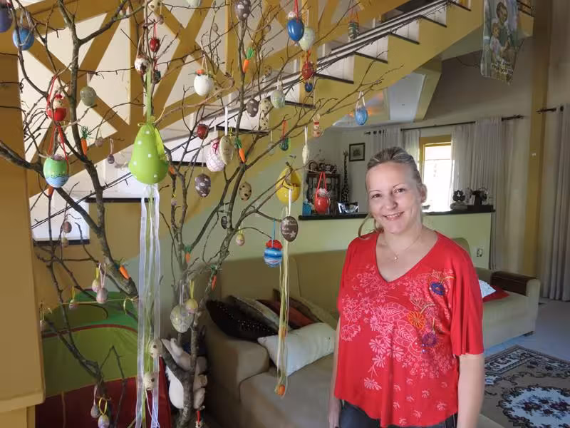 Há 51 anos a Páscoa tem sabor especial para Nilda e o esposo. Desde que casaram, os pais de Roselaine gostam de cuidar da decoração. Fazer cestinhas, pintura em madeira e em tecido de coelhinhos, ratinhos e palhacinhos de casquinhas de ovos, além, é claro, da Osterbaum, estão entre as principais confecções do casal.