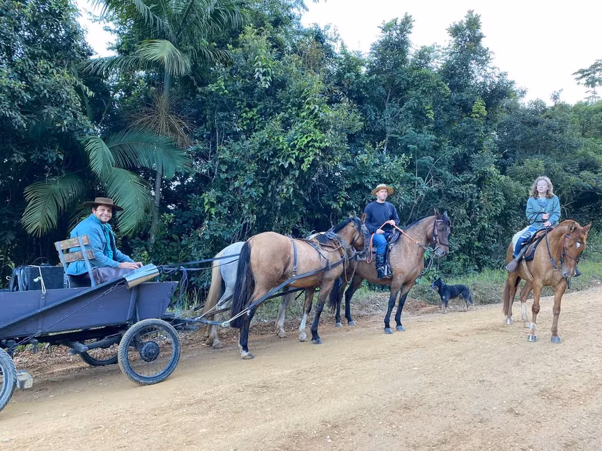 Devoto a Santa Paulina, o morador do Dom Joaquim Maurício Radavelli, 31, vai até o Santuário de carroça. Ele conta que faz o caminho há anos. “É o nosso lazer, gostamos de ir na Madre Paulina a cavalo. Nós sempre vamos, adoro ir na missa lá. No último final de semana de agosto vamos de novo e aí sobe a tropa toda”, diz.