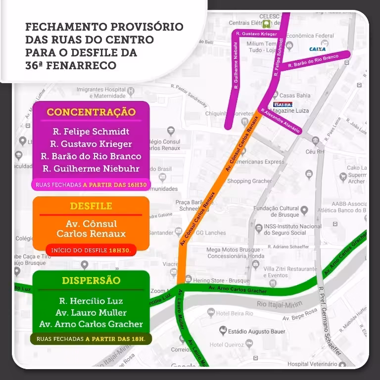 A Prefeitura de Brusque, por intermédio da Diretoria de Trânsito, solicita aos proprietários de veículos que não estacionem nas vias que serão utilizadas para concentração e desfile, evitando assim a remoção pelo serviço de guincho. Também, orienta aos moradores que retirem veículos das garagens antes da interdição destas vias.